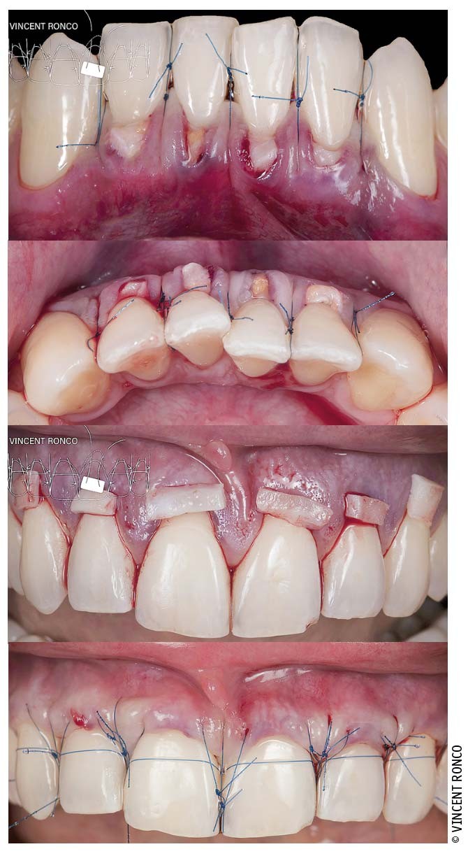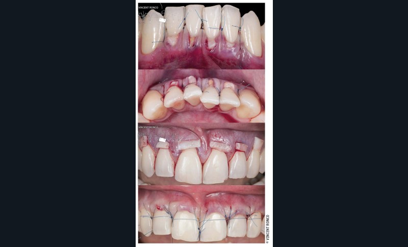 En effet, en préalable de l’action chirurgicale, le Dr Ronco défend une analyse précise de l’anatomie dentaire dont découlent des aménagements et reconstructions biomimétiques de la jonction amélo-cémentaire. La gencive a besoin d’être guidée par la morphologie dentaire pour que les tissus se repositionnent à l’unisson. Il convient donc de gérer les concavités radiculaires identifiées et de traiter les patients présentant une parodontite dans les deux mois précédant la chirurgie plastique envisagée, et dans le mois précédant dans le cas d’une gingivite. Le Dr Ronco retient que la littérature ne relève pas d’intérêt particulier des traitements chimiques de surface des racines exposées.