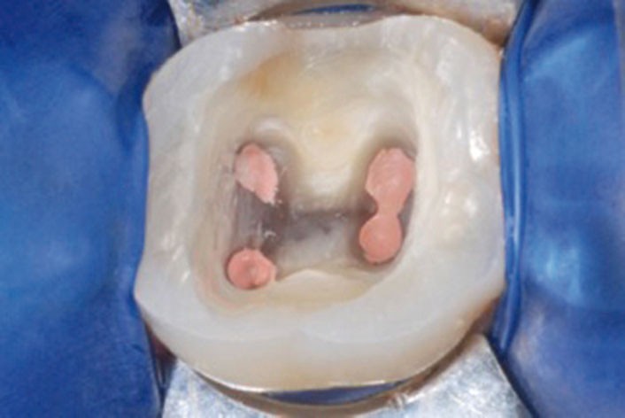 3. Mettre la dent en condition pour le traitement : il convient de déposer les reconstitutions en totalité, et de réaliser une reconstitution pré-endodontique, pour éviter la percolation salivaire et constituer un réservoir pour le produit de désinfection.