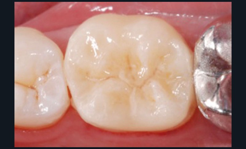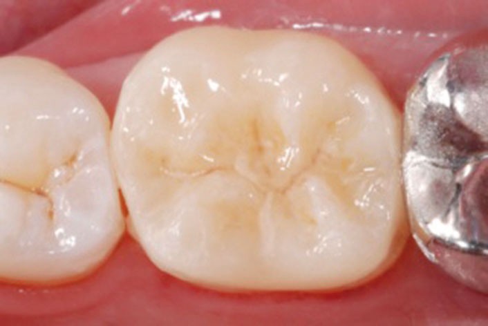 Le principe actif de l’éclaircissement interne est le peroxyde d’hydrogène (H2O2) contenu dans le produit éponyme ou dans le peroxyde de carbamide. Le risque majeur de l’éclaircissement interne est la résorption cervicale externe (RCE), qui apparaît plus fréquemment avec des produits à concentration élevée en principe actif. C’est pourquoi l’éclaircissement interne sera réalisé à l’aide de produits avec des concentrations faibles, de 3 à 10 % d’H2O2, c’est-à-dire de 10 à 16 % de peroxyde de carbamide. De même, le respect du protocole opératoire est un prérequis indispensable pour éviter tout risque de RCE. Un diagnostic endodontique sera réalisé, puis la cavité sera nettoyée sans diminuer l’épaisseur des parois, qui ne doivent pas être trop fines. Un bouchon de CVIMAR scellera l’entrée canalaire, puis le produit d’éclaircissement sera disposé dans la cavité, elle-même fermée à l’aide de composite fluide. La durée d’action du peroxyde d’hydrogène est limitée à une heure, tandis que celle du peroxyde de carbamide s’établit entre 7 et 8 heures : on préférera la seconde forme galénique, que l’on pourra renouveler rapidement. Enfin, le composite stratifié définitif obturant la cavité sera réalisé lors d’un contrôle du résultat une semaine après traitement.