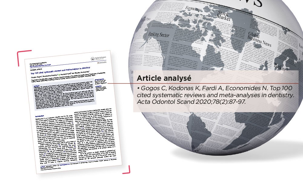 Après la fin des vacances, ce numéro de votre revue L’Information dentaire, qui ouvre une nouvelle saison d’informations scientifiques et professionnelles, marque aussi la 100e revue de presse que je vous propose pour la rubrique actualités internationales. À cette occasion, j’ai choisi de refaire le point sur sa philosophie et ses objectifs en m’appuyant sur un article paru en 2020 qui présente les 100 articles les plus cités jusqu’alors dans les domaines de la dentisterie. L’objectif de ses auteurs est d’appliquer une méthode d’analyse quantitative de la littérature appelée « bibliométrie » qui consiste ici à apprécier l’influence d’un article dans la communauté scientifique pour l’évaluation des performances de recherche d’auteurs individuels, d’institutions, de revues ou de pays, mais aussi pour dégager les tendances des thèmes les plus pertinents.