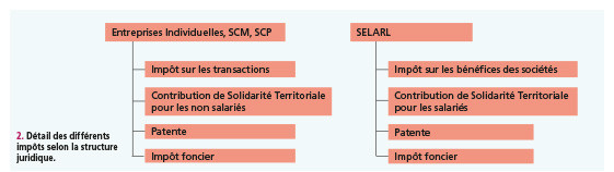 Bien qu’il n’existe pas d’impôt sur le revenu à proprement parler, les praticiens libéraux doivent s’acquitter de plusieurs impôts différents selon le statut juridique de leur exercice. Ce sont des impôts progressifs qui restent faibles par rapport à l’impôt sur le revenu appliqué en Métropole [7] (fig. 2).