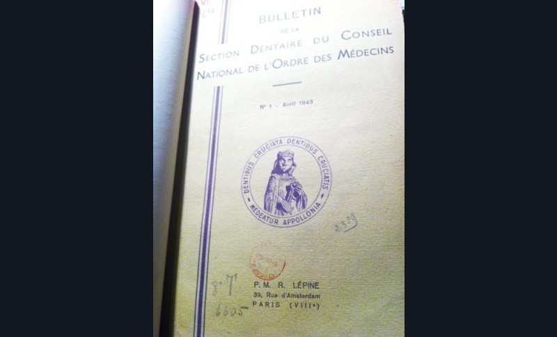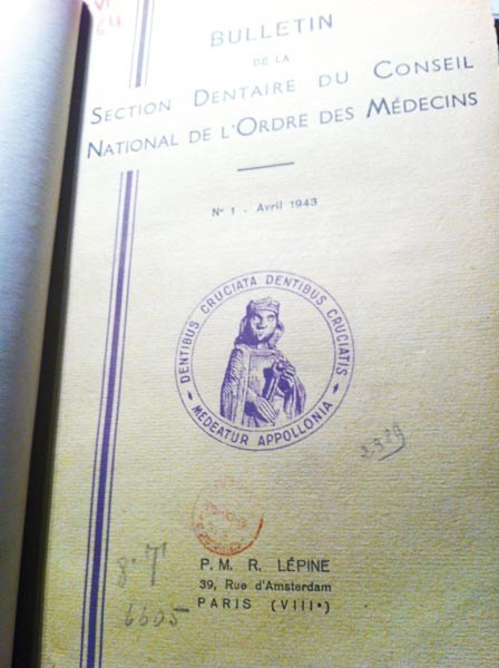 Et elle reste évidemment très présente dans l’esprit des chirurgiens-dentistes dont elle est le symbole. Le choix d’un saint patron par corps de métier est un usage datant des corporations médiévales (les corporations seront abolies en 1791). Pour renforcer la présence au quotidien des personnages de l’église, ils sont assimilés à une profession en fonction de leur martyre, de leur vie, ou de leur activité. À la suite de la dissolution des syndicats sous l’occupation, la section dentaire du Conseil de l’Ordre des Médecins, fondé en 1942, édite un bulletin qui présente en couverture sainte Apolline et la devise suivante « Dentibus cruciata Dentibus cruciatis. Medeatur Appollonia », ce qui signifie « qu’Apolline martyrisée en ses dents soit secourable à ceux qui souffrent des dents. » (fig. 5).