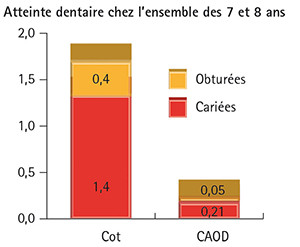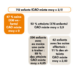 Le CAO mixte moyen est de 2,1 et 13 % des enfants présentent un CAO mixte supérieur à 5. Le besoin de soins concerne 47 % des enfants.