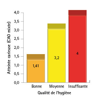 Une hygiène initiale mauvaise ou insuffisante augmente de 2,16 le risque de présenter une carie en denture temporaire et augmente de 1,96 le risque de présenter une carie en denture permanente. L’amélioration de l’hygiène, et donc la suppression de ce risque dans l’ensemble de notre population, éviterait 36,85 % des lésions en denture temporaire et 13,46 % des lésions en denture définitive.