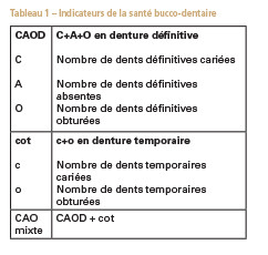Afin d’évaluer la santé dentaire sont utilisés la proportion d’enfants indemnes de caries ainsi que divers indicateurs de l’atteinte carieuse sur dentures définitive (CAOD), temporaire (cot) et mixte (CAO mixte)(tableau 1).