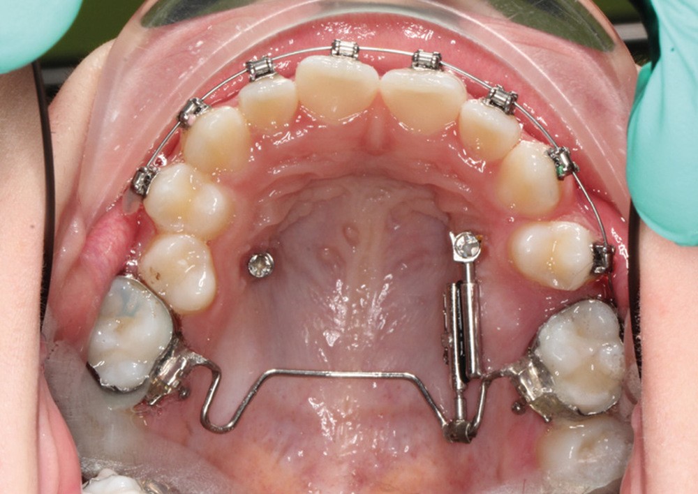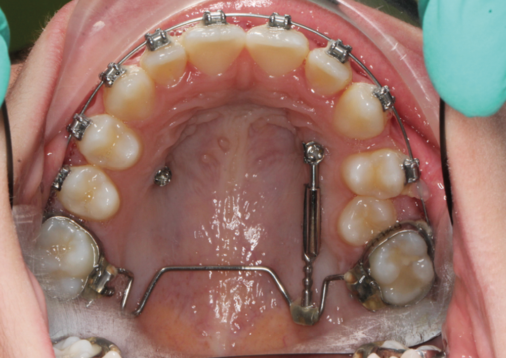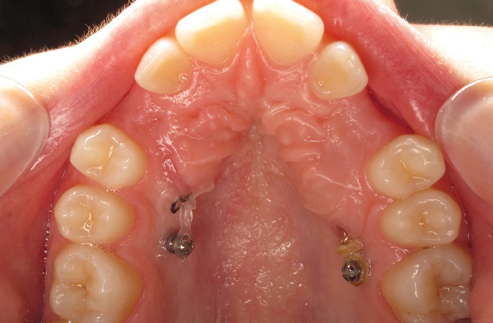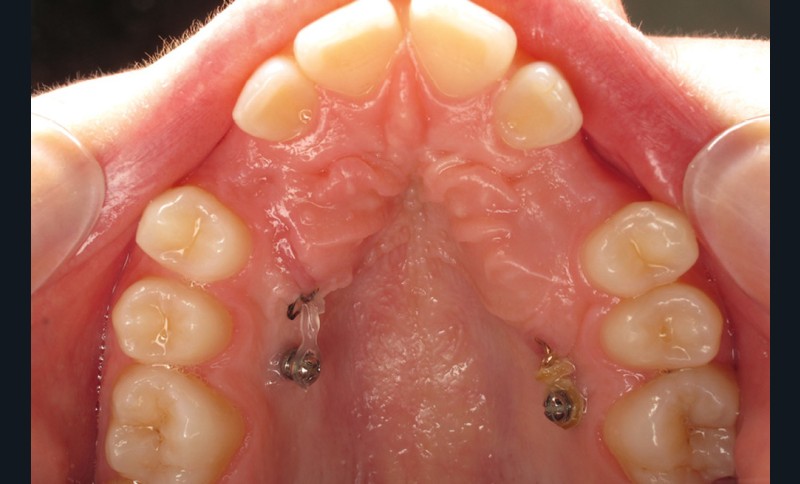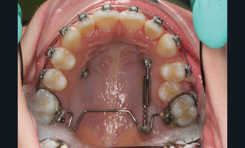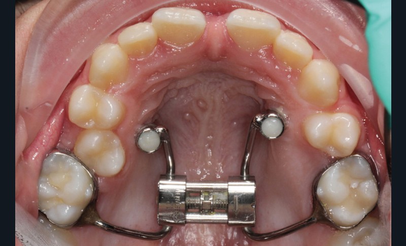 À côté de la coopération moindre qu’ils exigent, les ancrages squelettiques présentent également l’avantage de répondre à des indications très variées : correction des sourires gingivaux (Dr Skander Ellouze, fig. 3a-c), distalisation ou mésialisation molaire, supports pour les masques faciaux, mini transpalatin sur vis après expansion, ressorts de rétraction pour mettre en place les canines incluses sans léser les racines des dents adjacentes [3] (Dr Stéphane Renger, fig. 4) ou appareils d’expansion maxillaire (Dr Hans Winsauer, Dr Guido Sampersmans, fig. 5a-c)…
