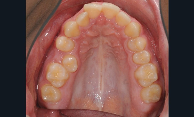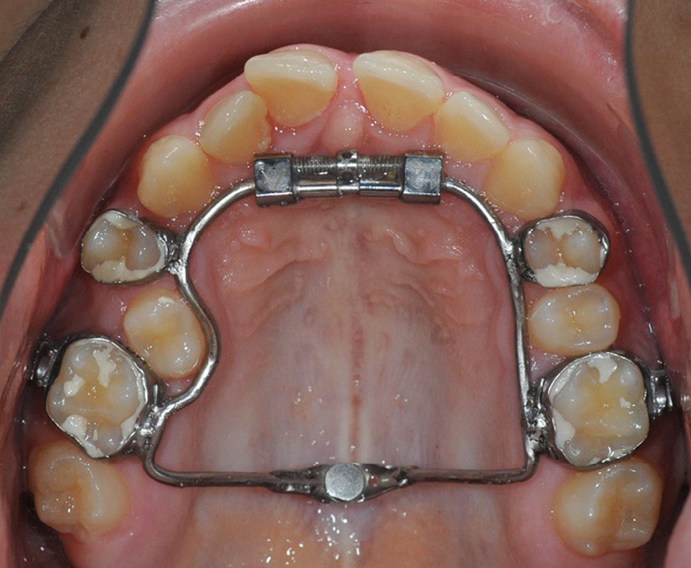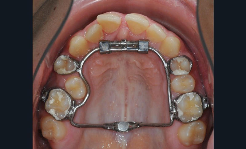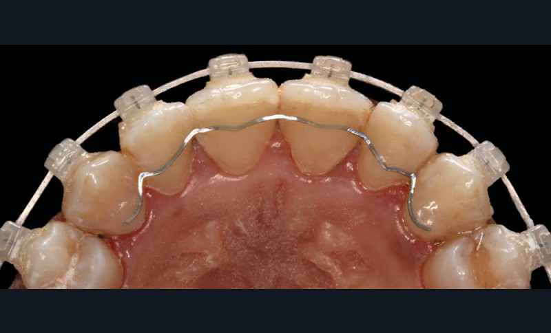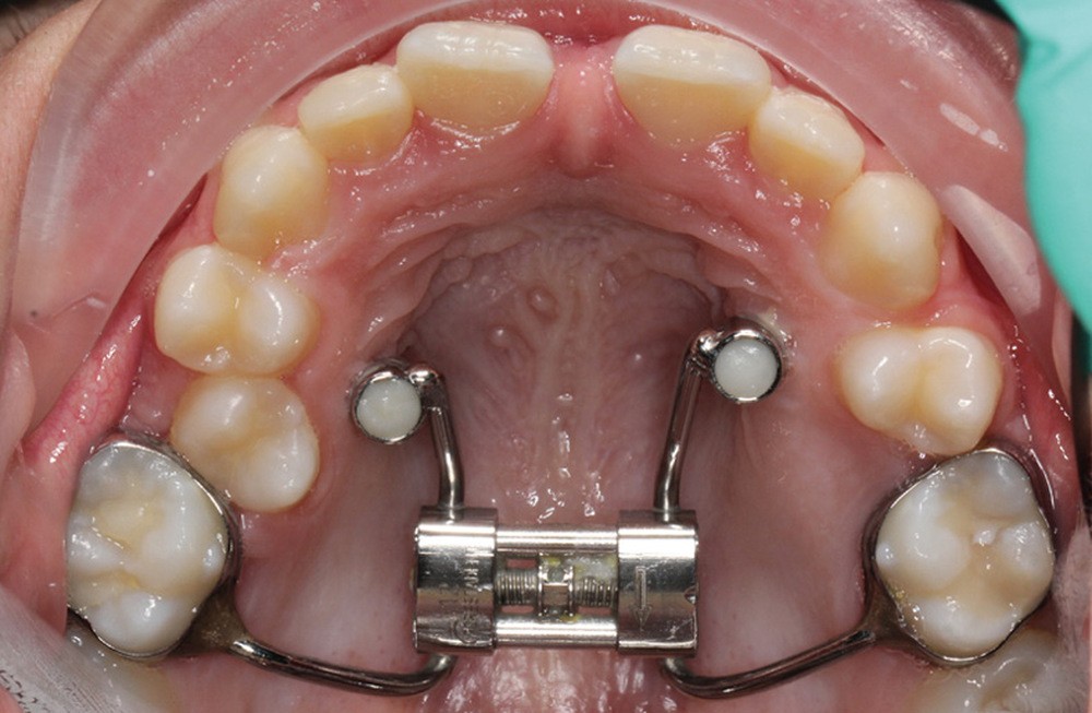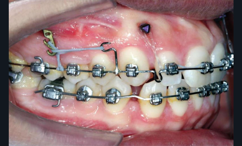 À côté de la coopération moindre qu’ils exigent, les ancrages squelettiques présentent également l’avantage de répondre à des indications très variées : correction des sourires gingivaux (Dr Skander Ellouze, fig. 3a-c), distalisation ou mésialisation molaire, supports pour les masques faciaux, mini transpalatin sur vis après expansion, ressorts de rétraction pour mettre en place les canines incluses sans léser les racines des dents adjacentes [3] (Dr Stéphane Renger, fig. 4) ou appareils d’expansion maxillaire (Dr Hans Winsauer, Dr Guido Sampersmans, fig. 5a-c)…