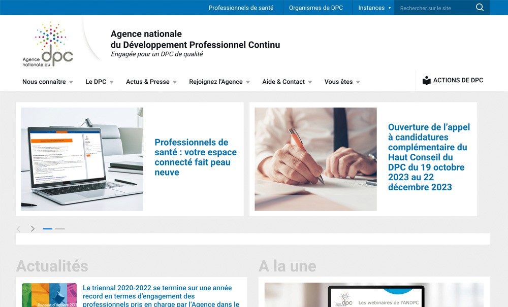 Depuis le 26 octobre, le site internet de l’Agence du DPC a fait peau neuve. D’utilisation « plus simple et plus ergonomique », il propose un nouveau moteur de recherche plus précis pour trouver rapidement une action de DPC, un affichage « en mode liste » plus lisible et une simplification des modalités d’inscription et d’accès à ses documents d’indemnisation ou de traçabilité.