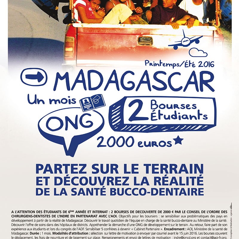 Après le Cambodge en 2015, deux nouvelles bourses d’un montant de 2000 e, destinées aux étudiants de 6e année et internat, sont attribuées cette année par l’URPS du Centre et le Conseil de l’Ordre de l’Indre, en partenariat avec l’Aide Odontologique Internationale (AOI), pour un séjour d’un mois à Madagascar au printemps/été prochain. Les objectifs pour les boursiers sont de se sensibiliser aux problématiques des pays en développement, de découvrir le travail quotidien de l’équipe dentaire au ministère de la Santé, de découvrir l’offre de soins dans les hôpitaux de province et un programme de prévention en zone rurale, d’appréhender la démarche d’une ONG de développement sur le terrain, de faire part au retour de leur expérience aux étudiants et, lors du congrès de l’ADF, de sensibiliser 5 confrères à devenir « cabinet partenaire ».