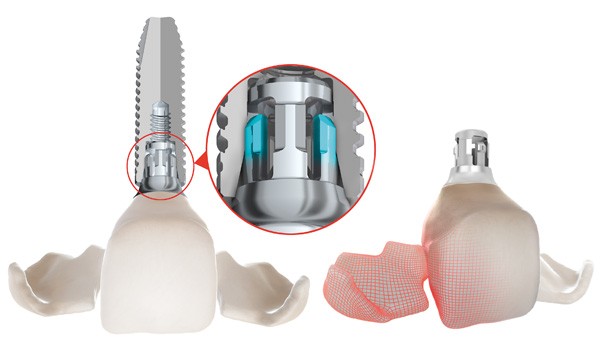 Cette solution présente plusieurs avantages : résultats esthétiques rapides, réduction du temps au fauteuil… mais aussi temporisation en un clic : la prothèse TempShell est associée à un pilier provisoire Temporary Snap Abutment et un pilier Multi-uni Abutment Plus, avec une chape provisoire à clipser, ce qui évite tout recours aux fixations par vis pendant l’essayage.