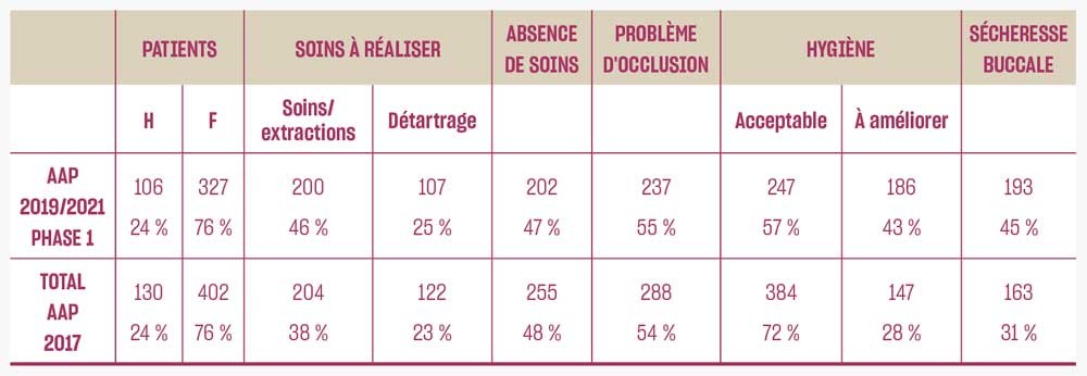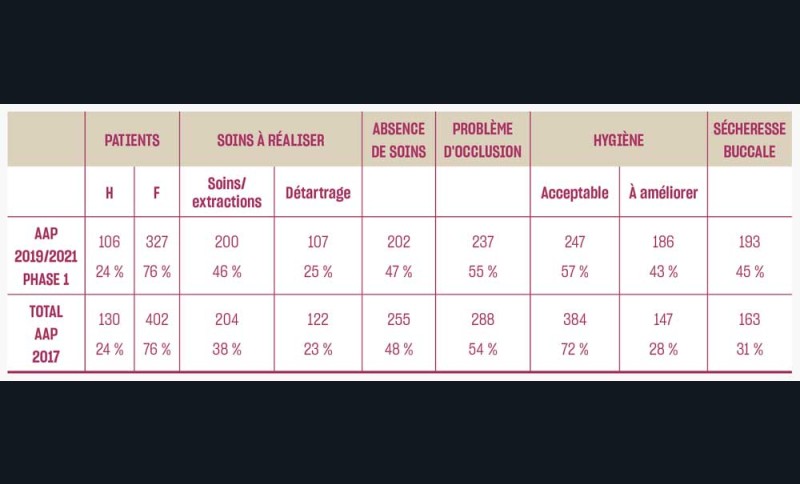 Deux études des Unions régionales des caisses d’assurance maladie (Urcam) en 2003 et 2007-2010 relevaient que 65 % des résidents avaient un besoin thérapeutique (soins et/ou prothèse) et une hygiène bucco-dentaire défaillante pour 60 % des résidents. Le recours au chirurgien-dentiste demeure inférieur de 25 % pour les personnes vivant en institution par rapport aux personnes vivant à domicile.