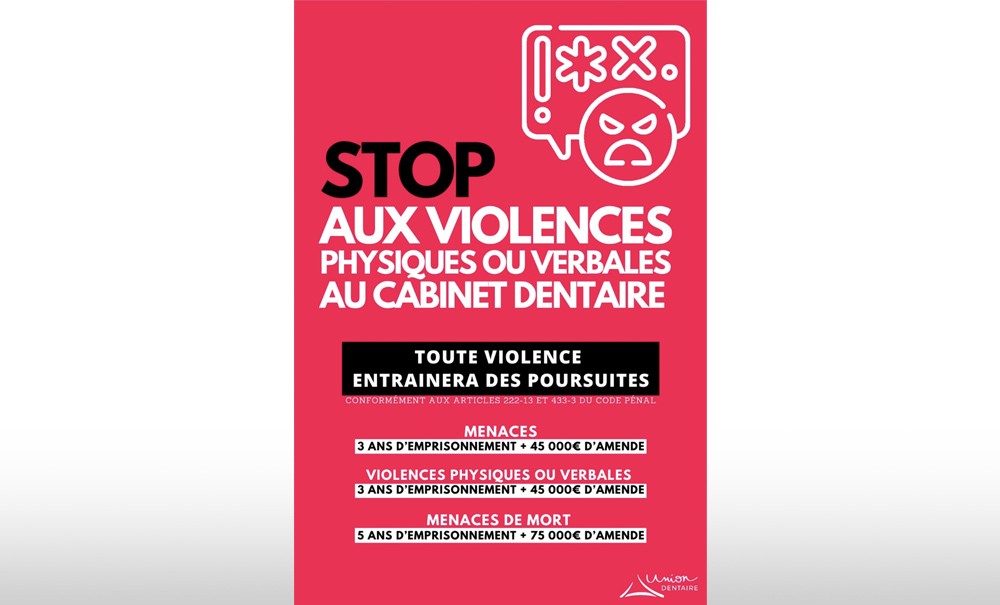 L’Union dentaire propose en téléchargement depuis le 19 septembre une affiche à installer dans la salle d’attente « pour informer les patients des risques encourus en cas d’agression ». Elle rappelle les poursuites encourues en cas de violence physique ou verbale contre un professionnel de santé (3 ans d’emprisonnement et 45 000 € d’amende) et en cas de menaces de mort ou menace d’atteinte aux biens dangereuse pour les personnes (5 ans d’emprisonnement et 75 000 € d’amende).