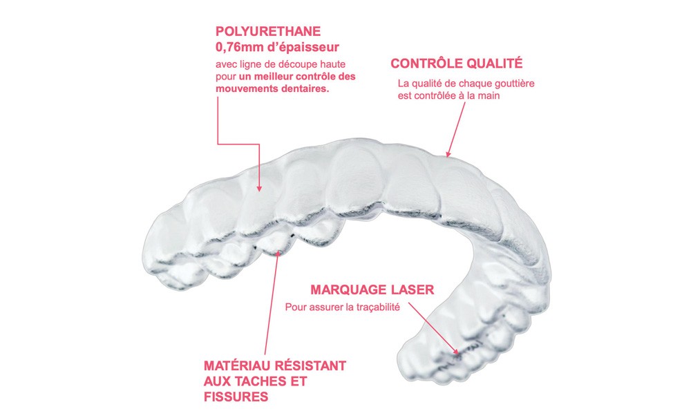 Les aligneurs sont fabriqués à partir de Zendura, un matériau polymère rigide de polyuréthane très résistant. La ligne de découpe au-dessus du collet apporte une rétention optimale, ce qui nécessite moins de taquets pour un traitement plus discret.