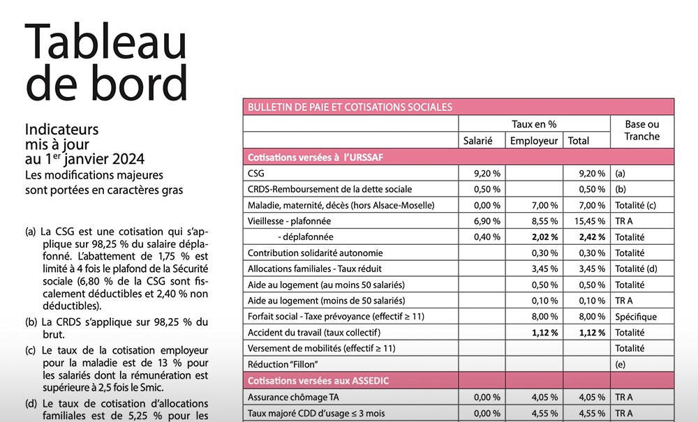 Accueil > Actualités > Fiscalité Tableau de bord fiscal du Bulletin de paie et des cotisations sociales 2024 Publié le 05.02.2024. Partager sur facebook Partager sur twitter Partager sur linkedin Commenter Indicateurs mis à jour au 1er janvier 2024 Consultez le tableau de bord > Thèmes abordés #Fiscalité Commentaires Laisser un commentaire Annuler la réponseVous devez vous connecter pour publier un commentaire. Sur le même sujet Actualité Communiqué Fiscalité Vie du cabinet Canada : succès pour le RCSD Mis en place au printemps 2024 le Régime canadien de soins dentaires (RCSD) couvre déjà près de six millions de personnes,... Newsletter Inscrivez-vous à la newsletter pour recevoir chaque semaine l’essentiel de L’Information Dentaire Je m'inscris E-learning DPC 27 formations E-learning 100% prises en charge. Consulter le programme