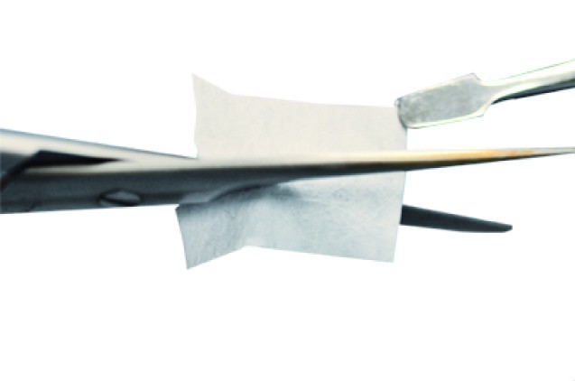 Un soin particulier a été apporté à sa manipulation. Elle conserve ses propriétés mécaniques lors de sa mise en place. Elle peut être utilisée directement à sec et sa rigidité ne change pas une fois humidifiée. Elle ne plisse pas et ne se déchire pas lors d’une manipulation prolongée. Elle ne s’effondre pas sur le défaut et ne nécessite aucune utilisation de membrane additionnelle. Elle conserve en outre son intégrité si elle se retrouve exposée, car elle reste moins susceptible à la dégradation enzymatique salivaire comparée à ses homologues en collagène. L’épithélium gingival recouvrira la partie exposée en 2 semaines.