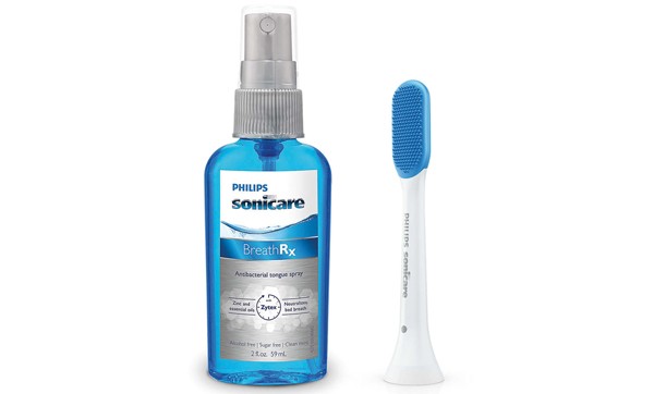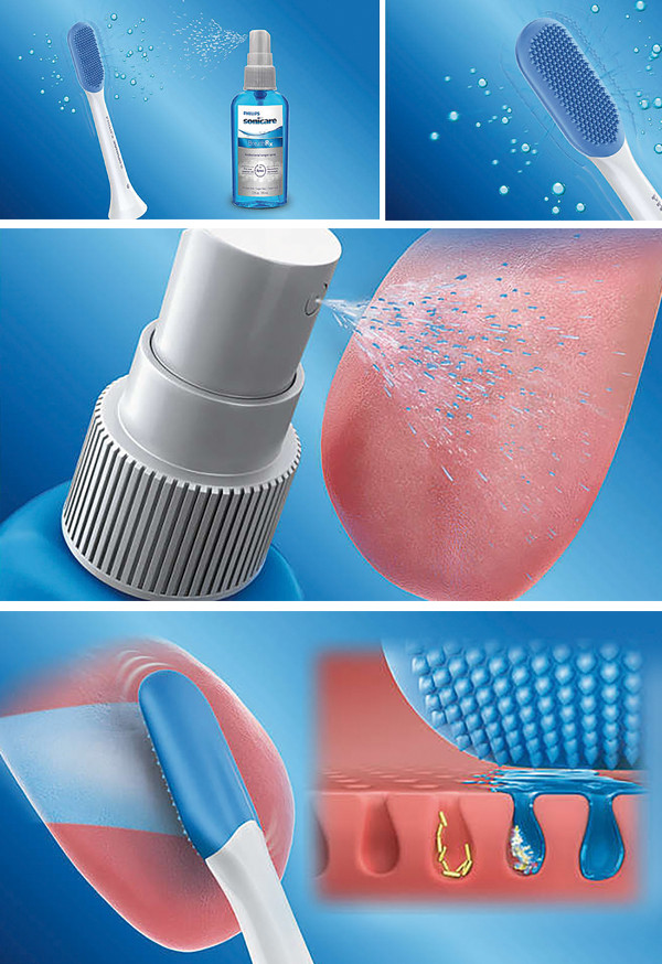 Bénéficiant d’une présentation soignée, le concept TongueCare+ regroupe en fait deux produits : une tête spécifique destinée à la brosse à dents Sonicare, et un spray buccal de petit format qui pourra même être transporté en bagage cabine, avantage appréciable pour les patients nomades. La tête présente une partie active rectangulaire, nettement plus réduite que les grattoirs manuels proposés jusque-là… Réalisée en silicone, sa face « travaillante » présente de minuscules picots qui doivent activer la diffusion de la solution déposée et déloger les enduits dans les zones les plus anfractueuses.