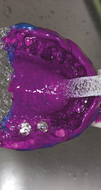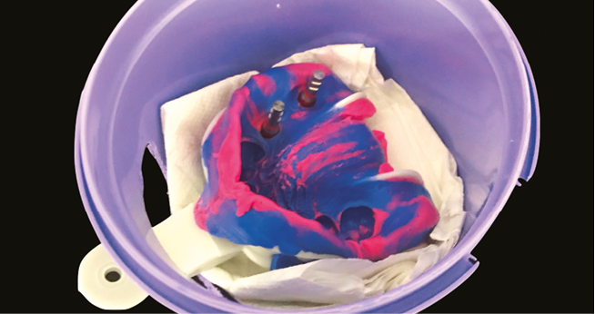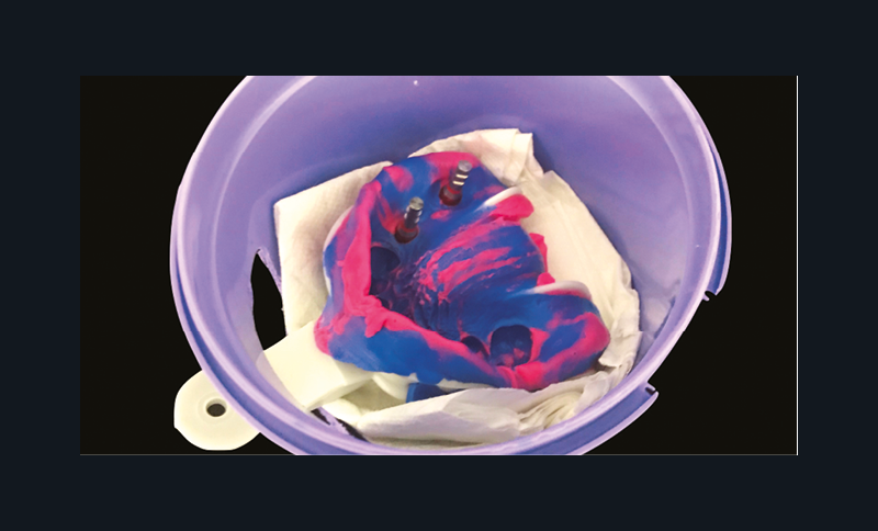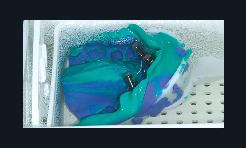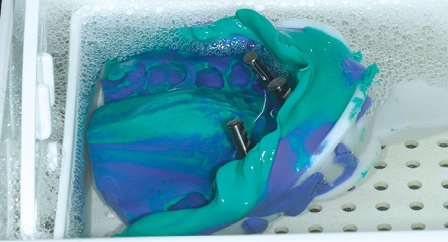 Après désinsertion, une empreinte se doit d’être décontaminée et traitée avant de la confier au laboratoire de prothèse. Les risques de contaminations croisées pour les assistant(e)s et les prothésistes sont importants et il en va de la responsabilité du praticien de protéger ses collaborateurs. Le simple rinçage de l’empreinte sous l’eau du robinet (fig. 1) élimine la plus grosse partie des pathogènes à la surface de l’empreinte. L’application de solution spécifique par pulvérisation ou immersion (fig. 2) termine la décontamination. Une empreinte contaminée va conduire à un modèle de travail contaminé, ceci exposera tous ceux qui seront en contact avec à des risques infectieux superflus.