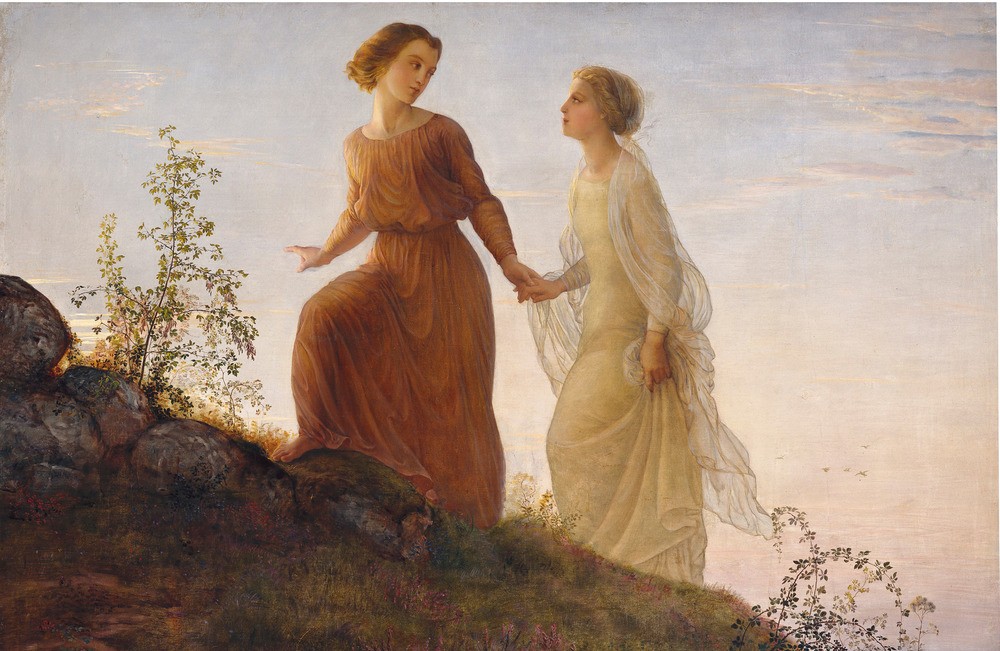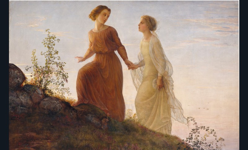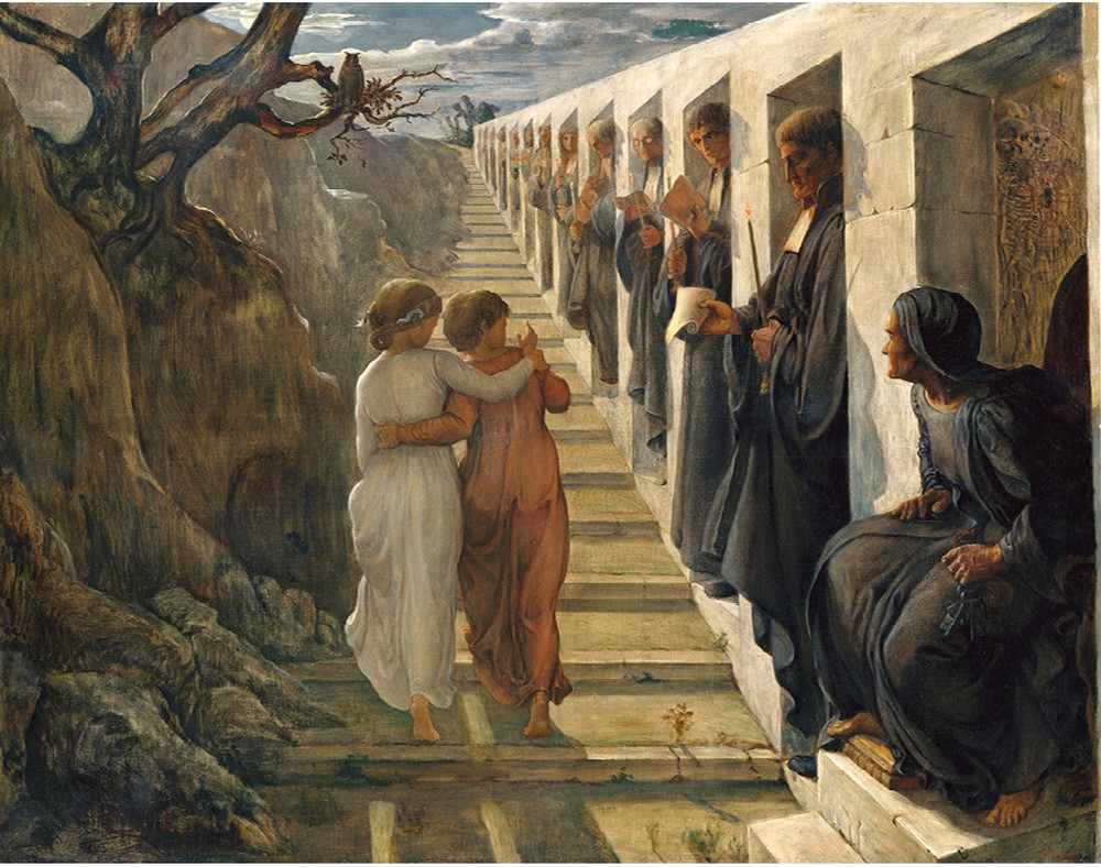 Pour Louis Janmot (1814-1892), l’enseignement matérialiste c’est le diable, ou en tout cas « le mauvais sentier » selon ses mots. Le salut, aux yeux de ce peintre-poète et fervent pratiquant, c’est le chemin de grâce d’une éducation qui élève l’âme, la garde des mauvais maîtres comme des mauvaises pensées et la maintient dans l’espérance malgré les doutes, les tourments, les séductions du mal et la fatalité mortifère. Le grand œuvre de sa vie entière sera de composer, en vers et en tableaux, son Poème de l’âme, vaste épopée spirituelle contant le parcours complet d’une âme sur Terre jusqu’à son ascension au Ciel. Il faut évidemment se replacer autant dans la sensibilité romantique éprise d’harmonies célestes que dans les débats moraux de l’époque, partagée entre foi et scientisme, pour comprendre ce qui, au-delà de la belle facture de l’élève d’Ingres, a pu séduire Delacroix, Baudelaire ou Gautier. On est en outre dans un moment où un certain catholicisme libéral (Montalembert, Lacordaire), après la loi Falloux sur l’école libre (1850), fait pièce aux idées laïques et progressistes sur ce qu’on appelle « la question scolaire » et, plus loin, « la question sociale », malgré l’opposition de Hugo qui craint « une arme dans la main du parti clérical ».