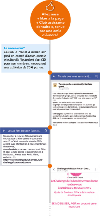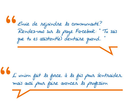 Car le praticien, très à l’écoute, fit aussitôt apparaître sur son écran d’ordinateur la page Facebook « Tu sais que tu es dentiste quand… », communauté de praticiens réunis sous le signe de l’humour et de l’entraide. « Aurore, pourquoi ne pas lancer une version pour les assistantes ? ». C’était en 2013. Aujourd’hui, la page compte près de 1 900 fans et organise des événements dans toute la France ! « Je n’y croyais pas, avoue Aurore. Et pourtant, ce groupe est devenu un lieu de rendez-vous quotidien pour les assistantes. Elles viennent y chercher des conseils techniques, organisationnels, juridiques. Mais surtout de l’écoute, du soutien. Ça fait toujours un bien fou de partager ses problèmes avec quelqu’un qui a les mêmes ! Ou qui peut donner des conseils d’autant plus pertinents qu’ils émanent d’un vécu semblable.