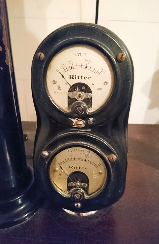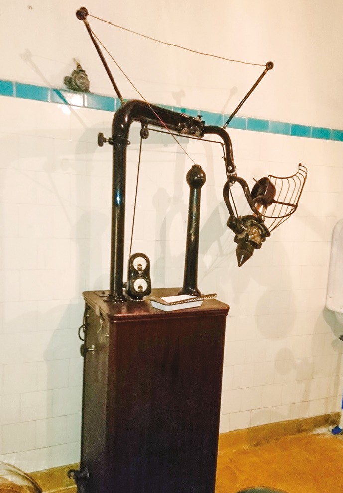 Tout cet équipement est accompagné d’un générateur de radiographie Ritter (décennie 1930) avec son volumineux double transformateur à bain d’huile pouvant produire des courants de 40 000 à 50 000 V, sous 10 à 20 mnA. Il alimente un tube RX de Coolidge, derrière sa grille de protection. Destiné aux radiographies buccales, il peut servir éventuellement pour des radios de la tête, d’une main, d’un thorax ou d’un pied (fig. 6a-b). Naturellement, toute une petite instrumentation est fournie en même temps, avec son lot de daviers et un stérilisateur Poupinel 1934. L’ASPAD est heureuse d’avoir pu participer à cette reconstitution de matériel rigoureusement d’époque avec l’AMICORF de Roquebrune-Cap-Martin qui continue à réaliser un travail gigantesque. Nous recommandons tout spécialement la visite très intéressante de ce site mémorable peu connu.