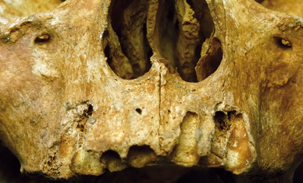 Au niveau des blocs incisivo-canins et prémolaires, un autre phénomène s’est produit, dont on ignore si une relation existe avec l’infection du côté opposé. Les régions alvéolaires correspondant à l’incisive latérale et à la canine à gauche et à la première prémolaire à droite ont été volontairement découpées pour l’arrachage des dents infectées. En effet, de part et d’autre des faces latérales du maxillaire, des portions régulières de forme rectangulaire de bas en haut ont été soigneusement découpées, comme en témoignent les traces de découpe laissées sur le bord supérieur des alvéoles. On retrouve une découpe nette sur le côté gauche avec notamment une autre trace sur le bord disto-vertical. Le fond des alvéoles concernées montre une infection probablement apicale. Il s’agit là d’un geste chirurgical opéré soigneusement et urgemment sur un individu dont l’état de santé bucco-dentaire s’est aggravé sérieusement si l’on tient compte de la série jugale atteinte par l’ostéite. Malheureusement, rien ne vient soutenir cette hypothèse.