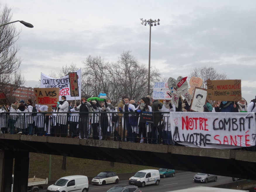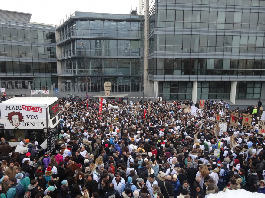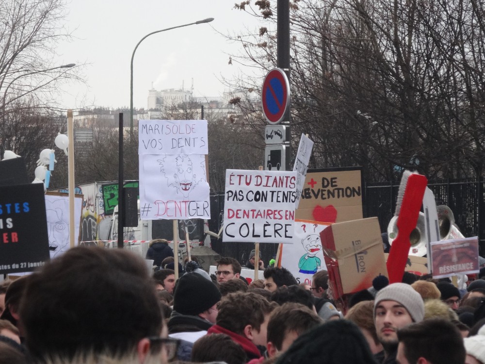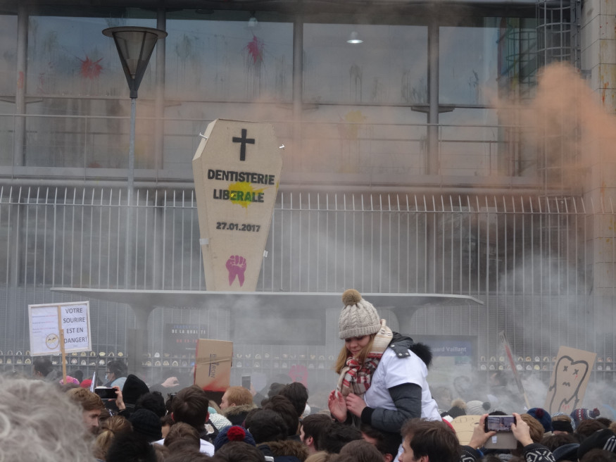 Ils étaient plus de 2000 ce matin (le 27 janvier) à manifester devant le siège de la Caisse d’assurance maladie à Paris (XXe) : étudiants surtout, mais aussi hospitaliers, enseignants, prothésistes, assistantes dentaires et libéraux. Le froid n’a pas calmé leur colère contre le règlement arbitral imposé par Marisol Touraine après l’échec des négociations conventionnelles. Jets d’œufs et de peinture contre la façade du bâtiment, fumigènes à gogo, sono à fond, slogans fleuris et même blocage du périphérique quelques petites minutes… Une première manifestation réussie qui augure bien d’une mobilisation générale de la profession dans les semaines à venir.