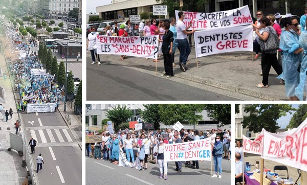 Désormais, plus de 60 départements sont concernés regroupant quelque 13 000 praticiens. Au programme de cette semaine de lutte : la fermeture de nombreux cabinets et, le 13 juin, des manifestations diverses devant les préfectures ou les CPAM comme en témoignent ces quelques images (issues des réseaux sociaux), avec un message positif à la clé pour les Français : une profession en lutte pour une meilleure prise en charge des soins et prothèses dentaires par la Sécurité sociale et contre la dévalorisation des soins prothétiques induite par le règlement arbitral.