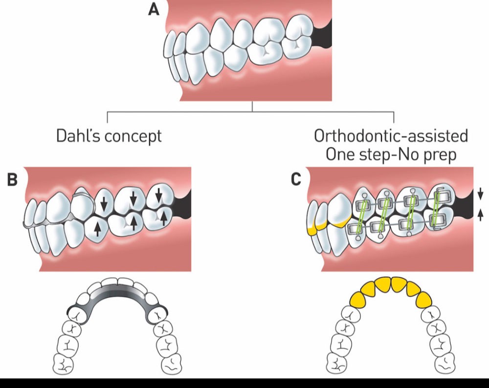 Il n’y a pas de contre-indication particulière, mais une bonne collaboration avec l’orthodontiste est nécessaire. En effet, si la relation myo-centrée est fortement différente de la position d’intercuspidation maximale et qu’une correction est souhaitée, des mouvements orthodontiques plus complexes qu’une simple extrusion peuvent être requis pour obtenir des rapports inter-arcades corrects. Enfin, il faut souligner le fait que dans les cas simples, le taux d’acceptation par les patients d’un traitement orthodontique qui dure seulement 2 mois et est localisé sur les dents postérieures est extrêmement élevé.