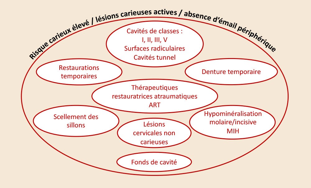 La figure en illustration de cette revue de presse donne un aperçu des indications des CVI en restauration directe lorsque le risque carieux est élevé, la lésion carieuse active ou encore l’émail périphérique absent.