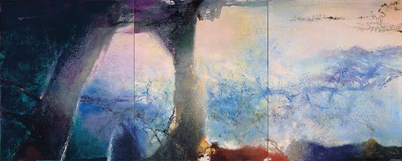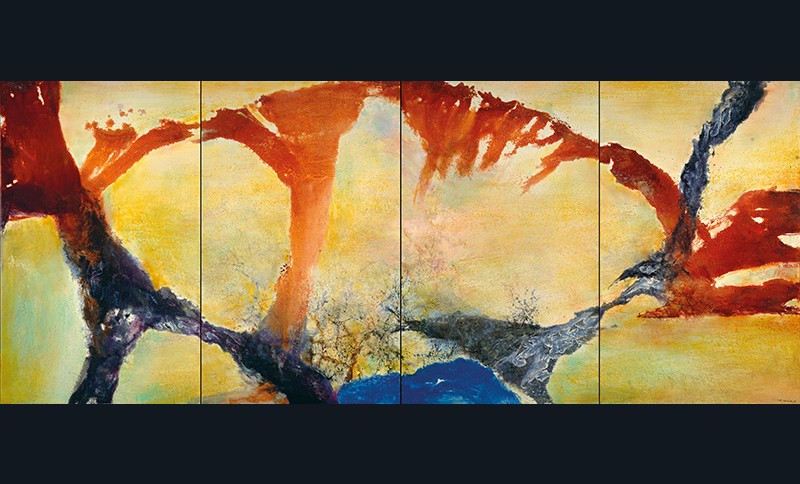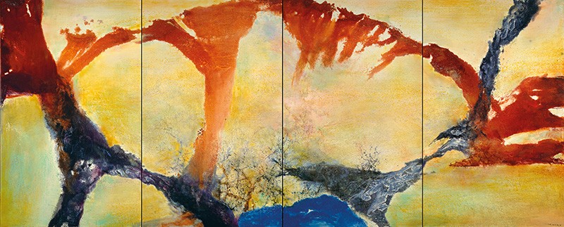 Au début des années 50, Zao Wou-Ki est « coincé dans la corne du buffle » à cause d’un mot, Signe, cher à Michaux avant de l’être à Barthes, sorte de Graal, de sésame absolu, d’alpha et d’oméga du langage, et il pense que Klee – le bien nommé – l’a trouvé. S’ensuit une période d’errements, sur trame de drames personnels. Son travail, gribouillages inintelligibles sur fonds monochromes, devient « illisible » à ses yeux mêmes ; ses toiles se vident de toute vie, végétale, animale, humaine ; il « peint dans le brouillard », lui dit Fernand Léger, ne vend plus rien. Un sursaut le sort du marasme au tournant de la décennie. La vie revient, avec un mouvement nouveau, des couleurs jamais employées, un rapport inconnu à la spatialité, qui évoque les recherches de Kupka**. L’espace n’est plus silence : bruit et fureur lui disputent ses droits, l’obligent à devenir rythme. Cette tension dramatique trouve un écho stimulant dans l’audition de Déserts d’Edgar Varèse, en 1954. C’est la base d’une amitié nouvelle et un pas décisif pour Zao Wou-Ki, qui déjà peint en musique. Partant des rapports liant le son, l’espace et le silence, il va les transposer en peinture et trouver, entre abstraction et figuration, sa vraie voie pour communiquer des sensations, des états d’esprit et d’âme, des résurgences émotionnelles, des tropismes affectifs.
