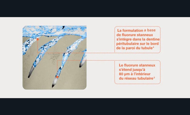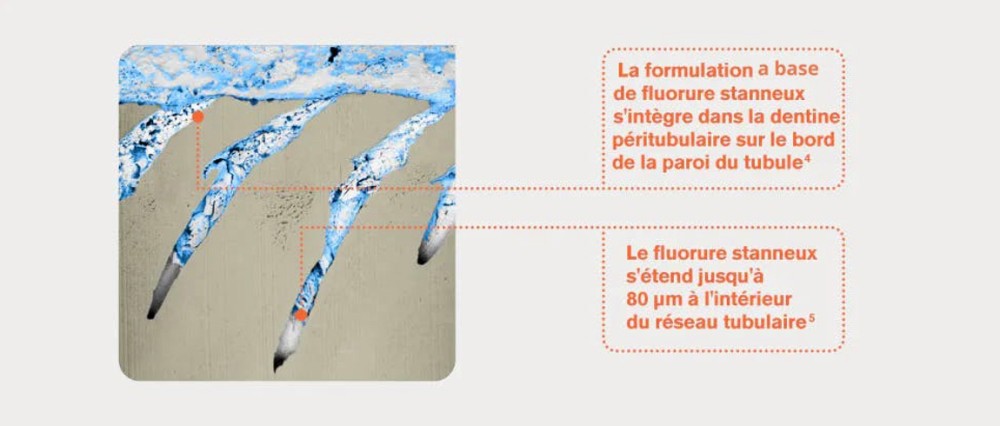 - Pour une prise en charge rapide, l’utilisation d’un dentifrice à base de Fluorure d’étain comme par exemple Sensodyne Rapide Action qui apporte un soulagement immédiat en 60 secondes de brossage et permet d’obturer 81% des tubuli dentinaires dès la première utilisation vs 51 % avec un dentifrice contenant 8 % d’arginine.