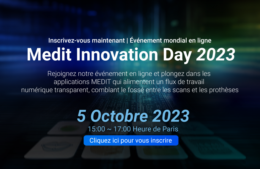 La Journée de l’innovation Medit 2023 est un événement en ligne gratuit ouvert à tous les dentistes du monde entier. Avec le lancement prochain de l’application Medit ClinicCAD, Medit est fière de présenter un logiciel de CAO dentaire transparent qui permet aux dentistes de concevoir efficacement des couronnes et des bridges, des inlays et des prothèses temporaires. La solution innovante de conception numérique s’intègre aux technologies de fabrication 3D avancées telles que l’usinage et l’impression 3D, marquant ainsi une étape importante vers une solution de prothèse dentaire rationalisée.