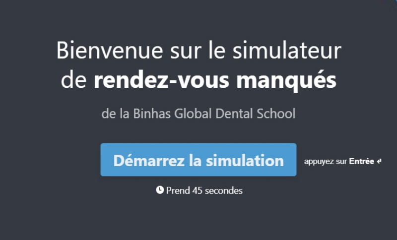 Simulateur de rendez-vous manqués Les rendez-vous manqués : un fléau pour tous les cabinets dentaires. En effet, plusieurs rendez-vous manqués peuvent engendrer une désorganisation globale de votre emploi du temps. Découvrez grâce à notre simulateur le nombre de rendez-vous non honorés (heures perdues) auxquels vous faites face chaque année. Un outil qui vous permet de comprendre l'impact de ce phénomène sur votre cabinet.