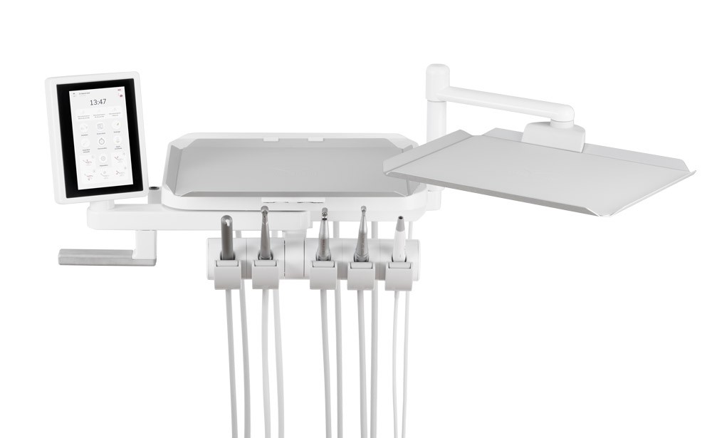Parmi les avantages, citons l’ensemble écran/clavier qui peut se placer à gauche ou à droite en quelques secondes. Chaque module d’instrument est inclinable indépendamment, pour éviter au maximum les mouvements qui peuvent provoquer des troubles musculo-squelettiques du poignet. La tablette elle-même comporte deux plateaux modulables et son bras, compensé et réglable en hauteur, s’adapte donc à la hauteur du praticien. L’assistante peut ainsi disposer de plusieurs surfaces pour préparer l’instrumentation, gage de plus grande efficacité dans le feu de l’action !