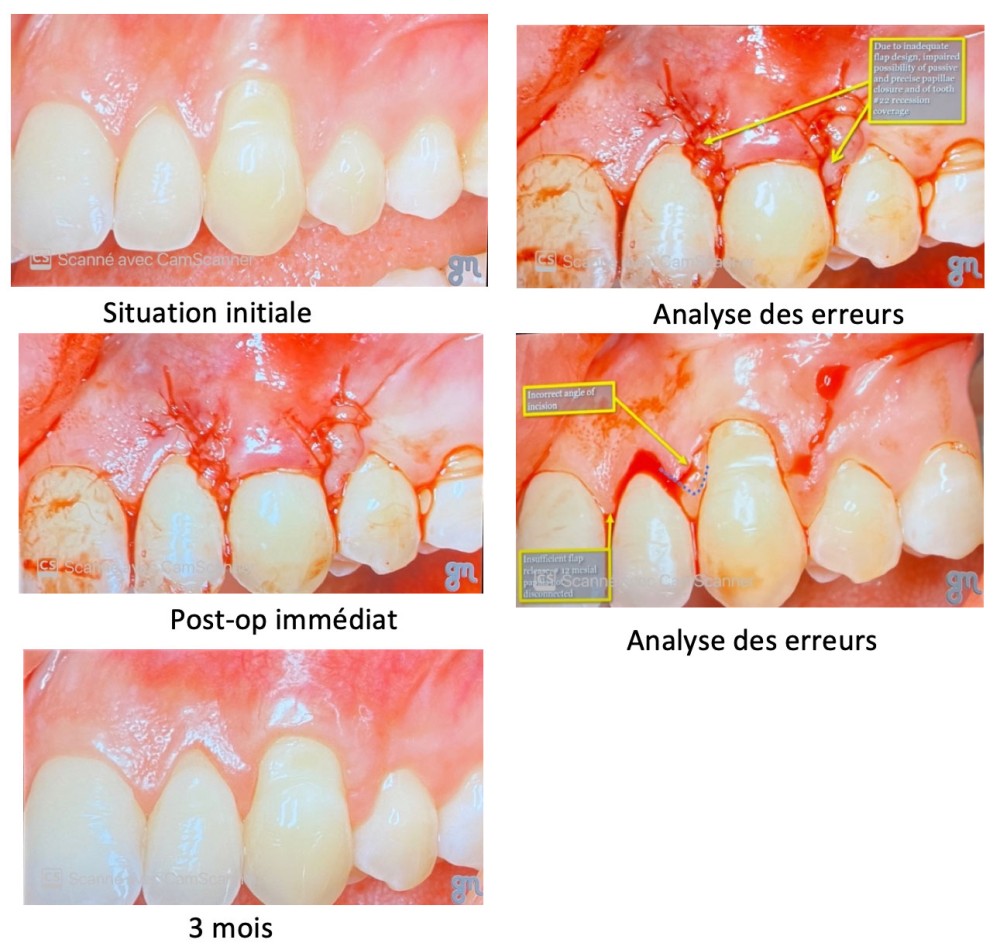 Les photos montrent un exemple de « cauchemar » en chirurgie plastique parodontale présenté par Moshe Goldstein avec analyse des erreurs commises.