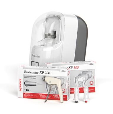 Le pack de démarrage propose aux praticiens tous les composants nécessaires : vibreur, pistolet applicateur et les cartouches de Biodentine XP disponibles en deux formats, 200 et 500 pour faire face à toutes les situations cliniques.
