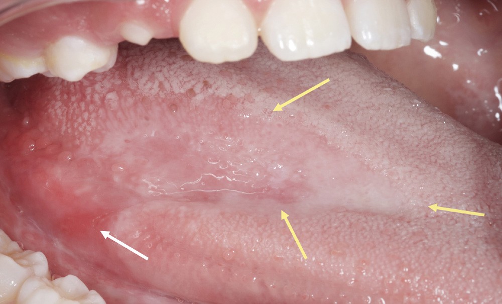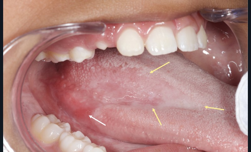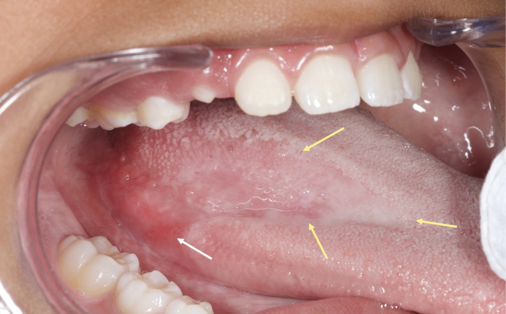 Une enfant de huit ans est reçue en consultation d’odontologie pédiatrique car elle se plaint, depuis plus de six mois, d’une douleur linguale à type de brûlure lors de l’ingestion d’aliments chauds ou épicés. L’interrogatoire médical ne révèle aucun antécédent médical ni prise de médication. De plus, les parents assurent n’avoir constaté aucun changement de comportement de leur fille, qui maintient ses activités scolaires et extrascolaires comme à l’accoutumée.