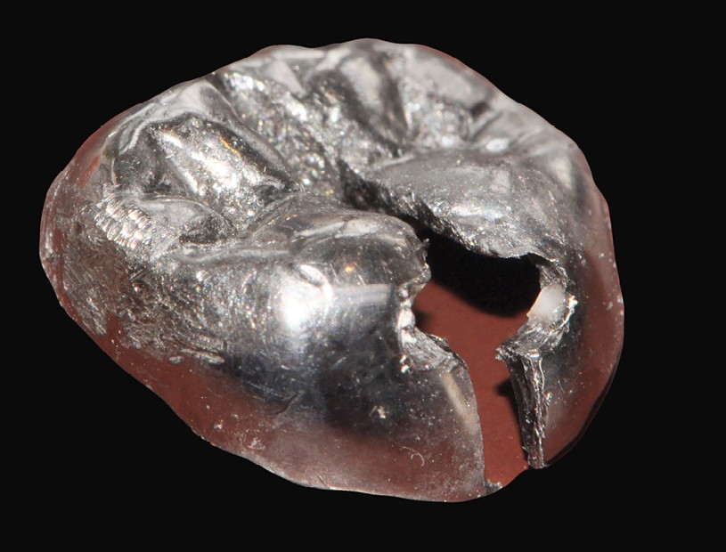 Des délabrements dentaires importants peuvent encore parfois conduire à devoir utiliser des reconstitutions coronoradiculaires. Si, autrefois, l’idée d’un renforcement de la dent par un tenon avait un certain écho dans notre profession, désormais il est clairement établi que le tenon n’a pour seul intérêt que de participer à la rétention de la portion coronaire, mais ne renforce nullement, bien au contraire, les tissus dentaires [13]. Cette volonté de réduire les risques de fracture radiculaire (fig. 5a, b) pousse les recherches vers des matériaux au module d’élasticité proche de celui de la dentine. La solidarisation des tenons aux coiffes type Richmond a peu à peu laissé sa place à des reconstitutions coronoradiculaires dissociées de la coiffe périphérique. Les alliages métalliques ont été pendant longtemps les seules possibilités pour la réalisation de ces RCR, en favorisant les alliages précieux pour leur plus faible module d’élasticité.