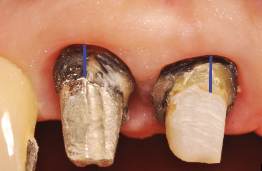 Actuellement, il semble que la nature du tenon ne soit plus vraiment au centre des préoccupations dans la décision clinique [16,17]. La présence d’un cerclage (ferrule, en anglais) semble être le paramètre prédominant, avec la quantité de tissu coronaire résiduel (fig. 6) [18]. Une recherche bibliographique sur le site PubMed (www.ncbi.nlm.nih.gov/pubmed) avec les mots-clés « ferrule » ou « ferrule effect » nous montre que cette notion est citée pour la première fois en 1990 [19].