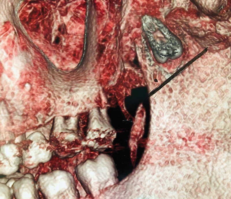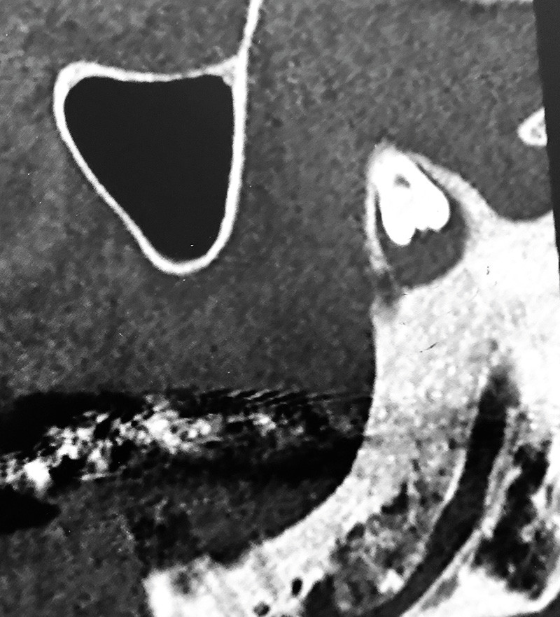 Il est impératif d’extraire 38 incluse ectopique (coroné) et d’énucléer la lésion kystique en rapport. Il est donc envisagé de réaliser une résection du coroné, ce qui permettra d’éviter une migration de la dent de sagesse dans la fosse infra-temporale (fig. 3).