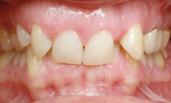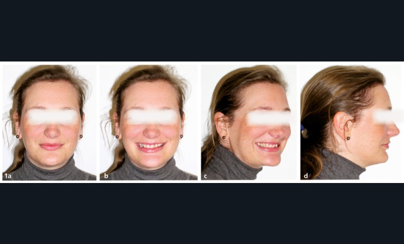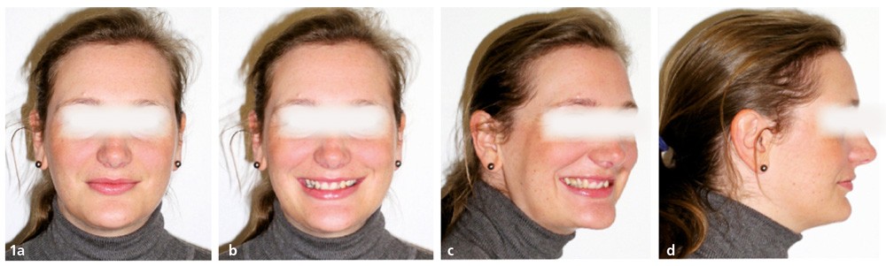 De face, les trois étages sont équilibrés. De profil, le menton est marqué et les lèvres en retrait par rapport à une ligne pointe du nez-menton. La patiente découvre peu ses dents mais ses lèvres sont bien dessinées et gracieuses. Le milieu inter-incisif ne coïncide pas avec le milieu de la lèvre supérieure. Les couronnes des incisives maxillaires ne sont pas totalement exposées lors du sourire. Les vues latérales du sourire sont caractéristiques d’une supraclusion sévère avec exposition gingivale et linguo-version dentaire (fig. 1a à d).