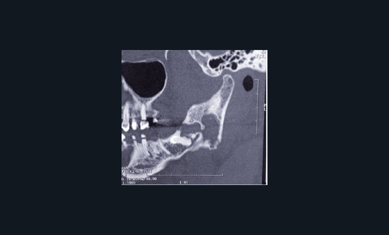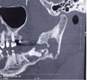 Le TDM retrouve une lésion lytique du ramus mandibulaire avec amincissement des corticales linguale et vestibulaire.