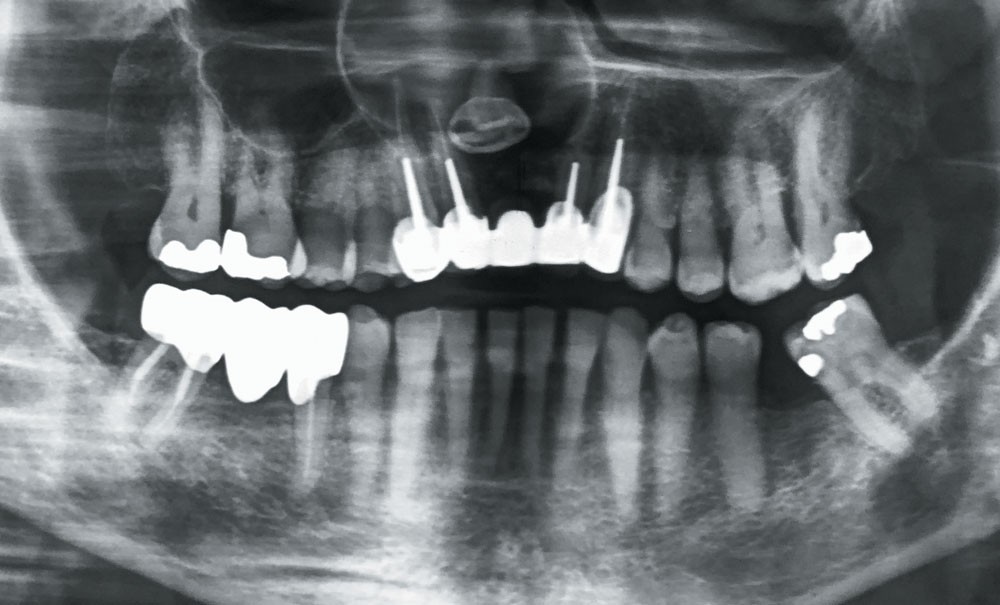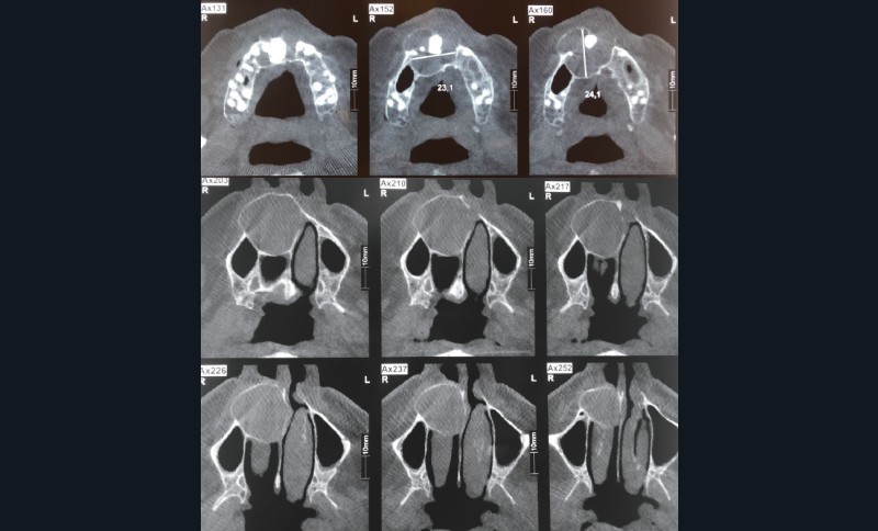 Du fait de l’existence d’une « coque osseuse », nous avons évité de cureter le sinus maxillaire droit. La fibromuqueuse palatine a été préservée, évitant la constitution d’une communication bucco-nasale. Le bridge a été conservé.