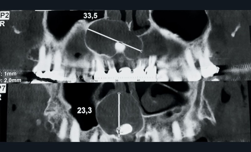 2. Le diagnostic de lésion kystique maxillaire étant posé, un examen tomodensitométrique est réalisé. Il met en évidence un volumineux kyste maxillaire antéro latéral droit (fig. 2 et 3).