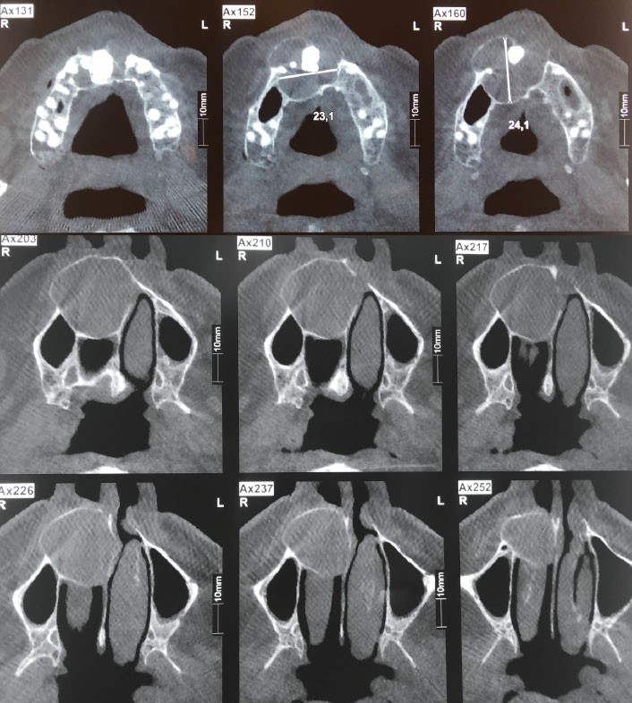 L’intervention, réalisée par une voie d’abord vestibulaire, a permis d’énucléer la lésion tout en respectant la muqueuse du plancher de la fosse nasale droite.