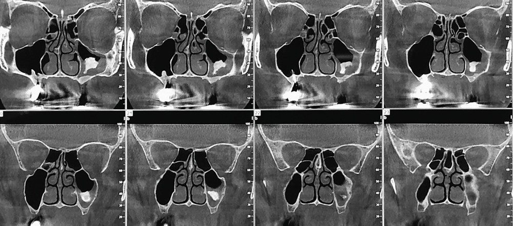 Dans le cas présenté, il s’agit de la découverte tardive d’une migration du substitut osseux dans le sinus maxillaire. Un curetage du sinus maxillaire par la même voie d’abord et sous couverture antibiotique est nécessaire.