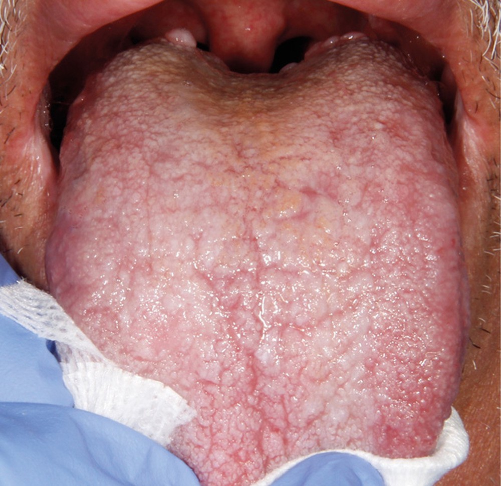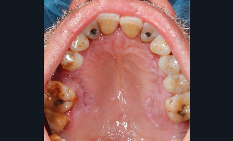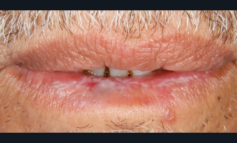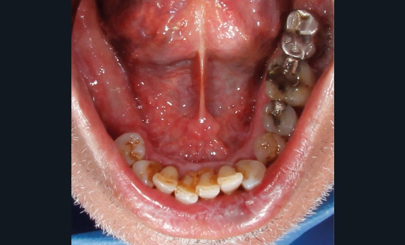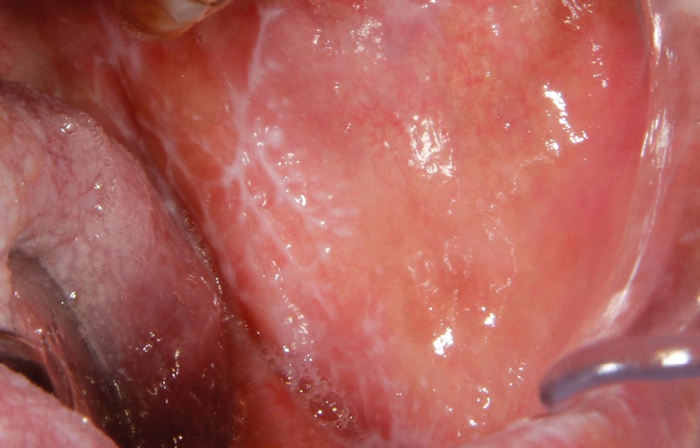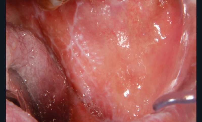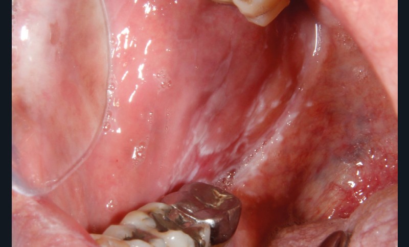 À l’interrogatoire, le patient affirme qu’il a des difficultés à maintenir une hygiène bucco-dentaire satisfaisante du fait des douleurs, et n’a pas pu consulter son chirurgien-dentiste pour son détartrage annuel en raison de la crise sanitaire en cours. L’examen clinique révèle une parodontite chronique (stade 3) généralisée et des lésions jugales (fig. 1 et 2), labiales (fig. 3) et gingivales (fig. 4) érythémateuses et kératosiques. Les lésions kératosiques jugales sont de type réticulé (fig. 1 et 2) ; les lésions kératosiques labiales sont associées à de petites érosions (fig. 3) ; les lésions palatines à des ulcérations (fig. 5). La langue présente une lésion blanche en « tache de bougie » (fig. 6) ; la muqueuse du plancher buccale est saine (fig. 7). Le signe de la pince est négatif. Le patient n’est pas porteur de prothèse dentaire malgré un édentement de moyenne étendue. Aucune lésion cutanée ou génitale n’est rapportée par le patient.