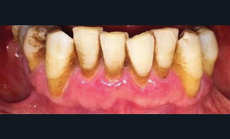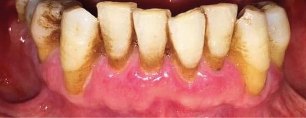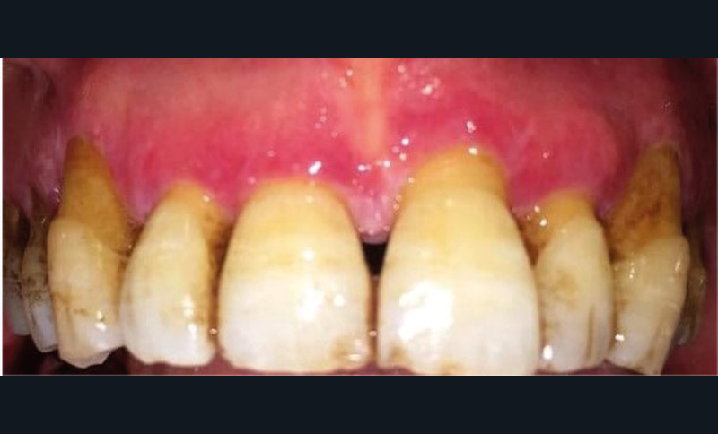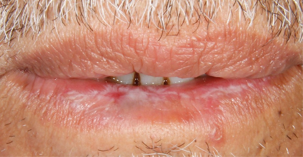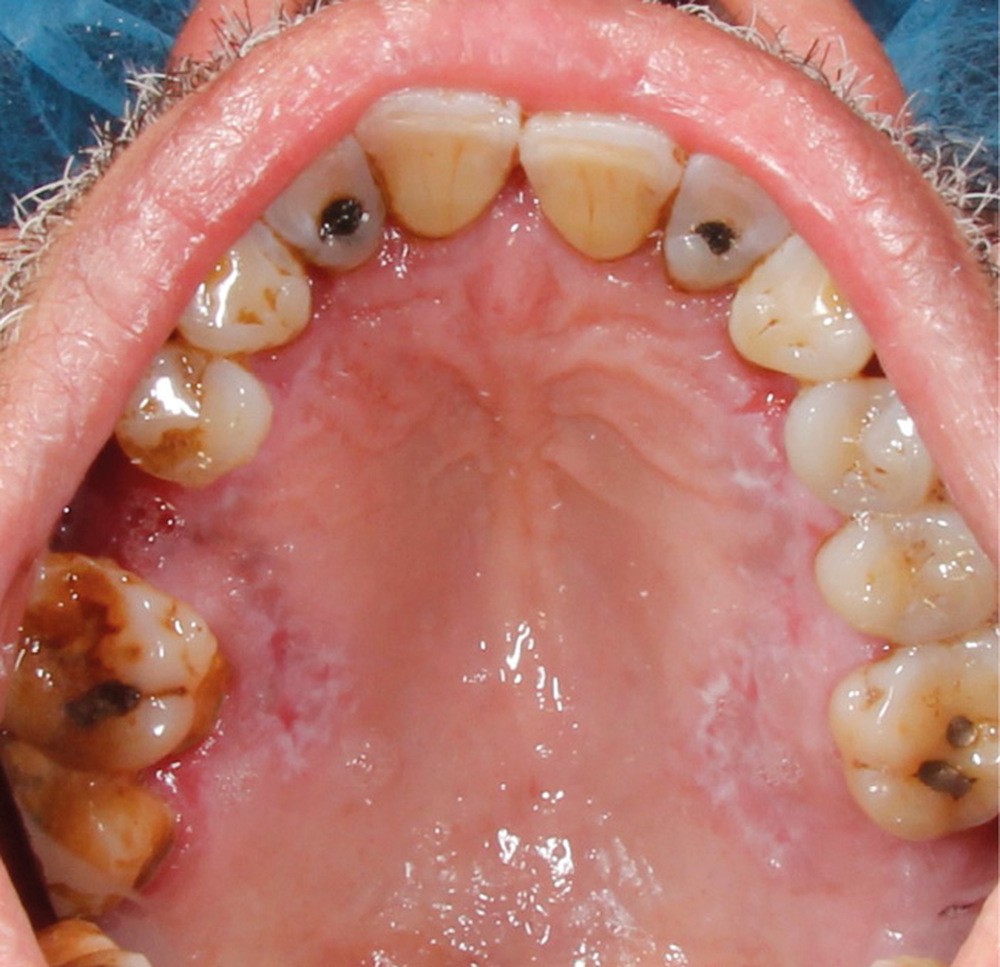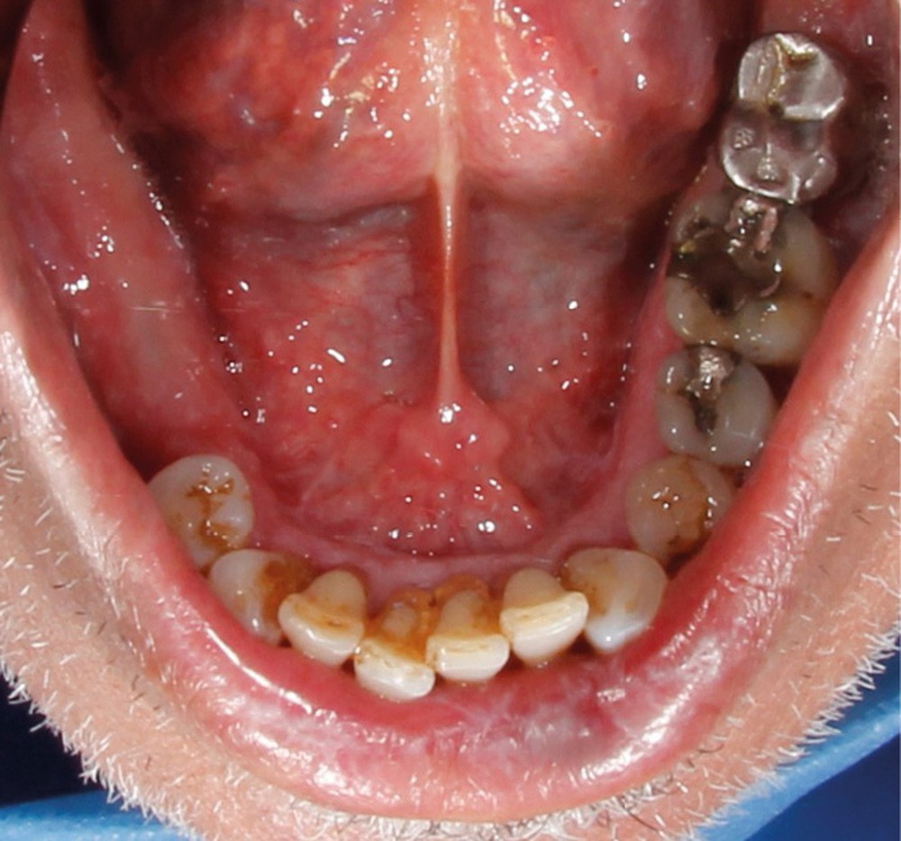 À l’interrogatoire, le patient affirme qu’il a des difficultés à maintenir une hygiène bucco-dentaire satisfaisante du fait des douleurs, et n’a pas pu consulter son chirurgien-dentiste pour son détartrage annuel en raison de la crise sanitaire en cours. L’examen clinique révèle une parodontite chronique (stade 3) généralisée et des lésions jugales (fig. 1 et 2), labiales (fig. 3) et gingivales (fig. 4) érythémateuses et kératosiques. Les lésions kératosiques jugales sont de type réticulé (fig. 1 et 2) ; les lésions kératosiques labiales sont associées à de petites érosions (fig. 3) ; les lésions palatines à des ulcérations (fig. 5). La langue présente une lésion blanche en « tache de bougie » (fig. 6) ; la muqueuse du plancher buccale est saine (fig. 7). Le signe de la pince est négatif. Le patient n’est pas porteur de prothèse dentaire malgré un édentement de moyenne étendue. Aucune lésion cutanée ou génitale n’est rapportée par le patient.