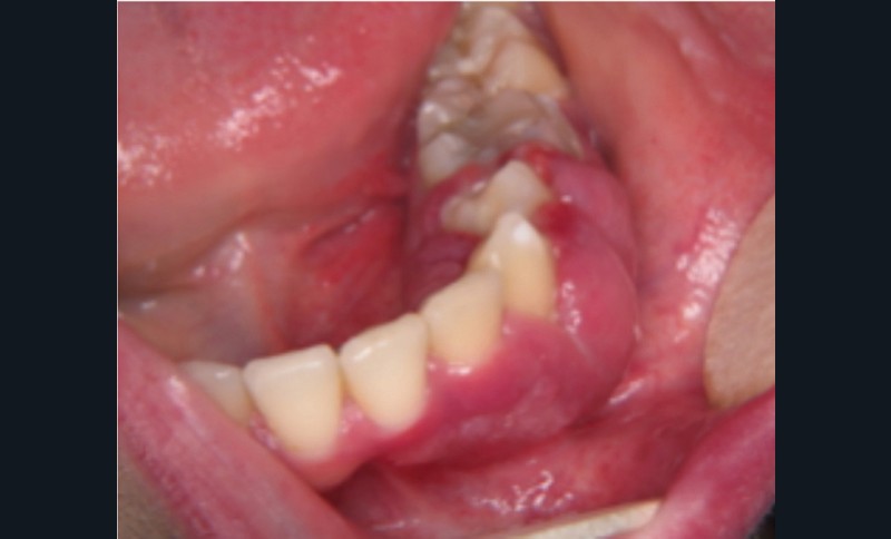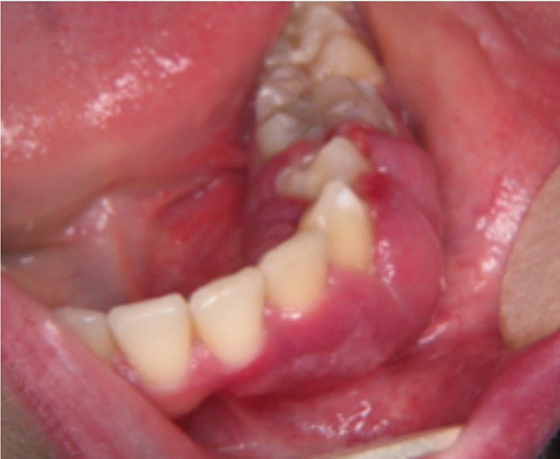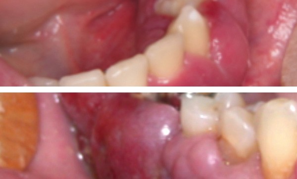 Histoire de la maladie. La patiente décrivait une augmentation progressive du volume gingival dans le secteur 3, non douloureux, qui gênait le brossage des dents depuis un an.