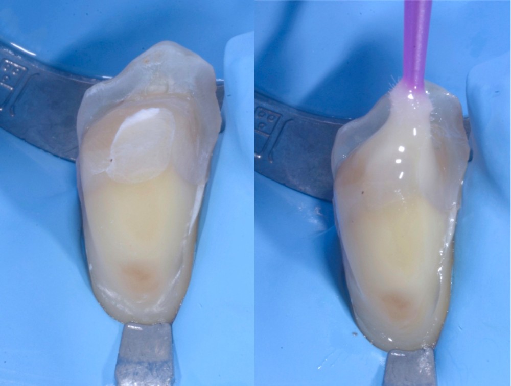 Un prétraitement supplémentaire au silane est toujours recommandé, même si l’adhésif universel contient un silane dans sa composition [72-76] car le silane incorporé dans la composition de ces adhésifs n’est pas censé se lier chimiquement aux vitro–céramiques [75] (fig. 11).